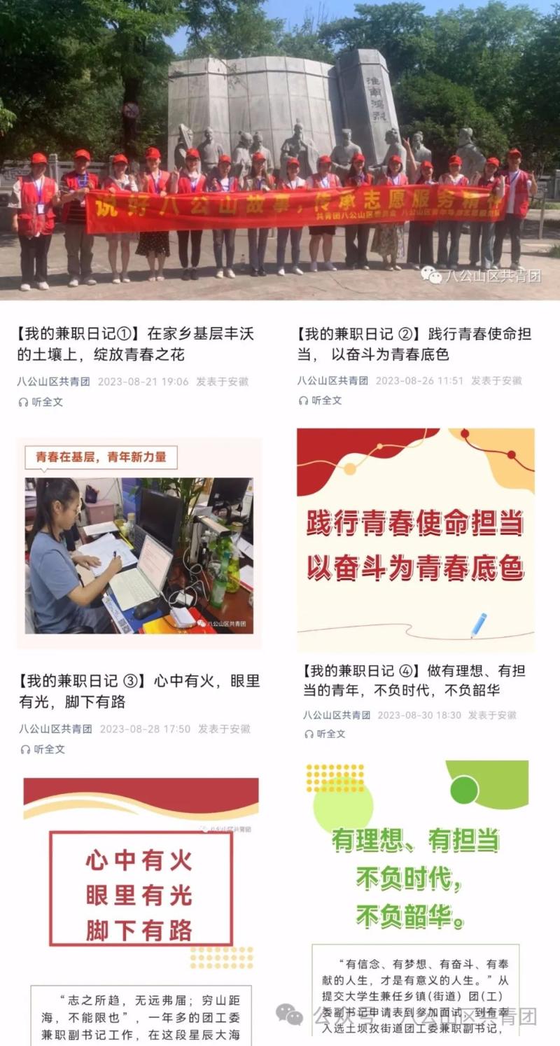 “我来做”做出新意。倾力打造23名青年志愿者组成的导游团队,积极宣传八公山浓厚的历史文化底蕴和生态宜游的自然环境,展现我区青年干部积极向上的精神风貌,传承无私奉献的志愿服务精神。创新刊登《我的实习日记》系列文章,从镇(街道)兼职大学生团委副书记视角出发,生动记录展现了这一青年团体在基层工作的所见所思所得。