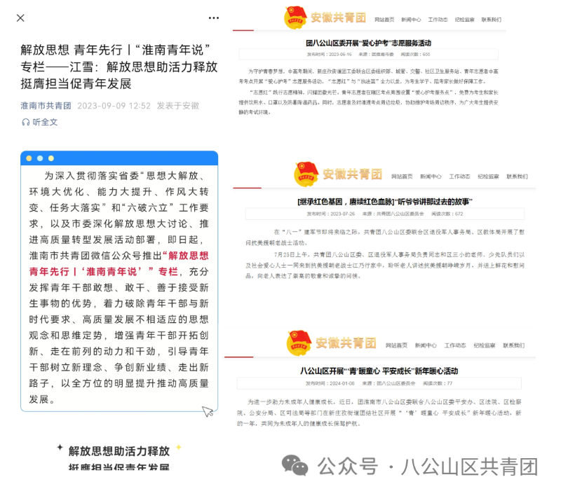 守牢意识形态宣传阵地。团区委牢牢把握意识形态阵地,在“八公山共青团”微信公众号,官方抖音号上,发布青年关注、展现我区青年干事创业新风貌的各类信息90余篇,同步积极向上级团委、淮南日报、区委区政府官方网站报送优质稿件进行正面宣传,省市共采用刊发稿件50余篇。团市委解放思想 青年先行“淮南青年说”专栏,刊登了我区两名团干的署名文章,展现了我区青年干部开拓创新、走在发展前列的动力和干劲。